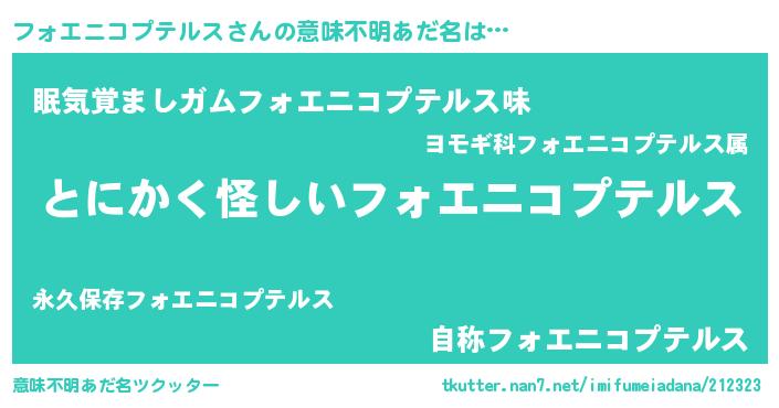 | ヘコむあだ名 | 『フォぷりん』『フォエニコプテルス(笑)』 |