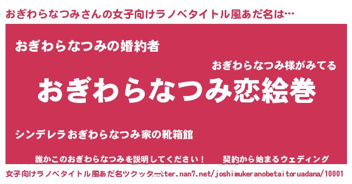 おぎわらなつみさんの女子向けラノベタイトル風あだ名は… 『おぎわらなつみ恋絵巻』『おぎわらなつみの婚約者』『誰かこのおぎわらなつみを説明してください! ~契約から始まるウェディング~』 ツクッター #女子向けラノベタイトル風あだ名ツクッター http://tkutter.nan7.net/joshimukeranobetaitoruadana/10001/