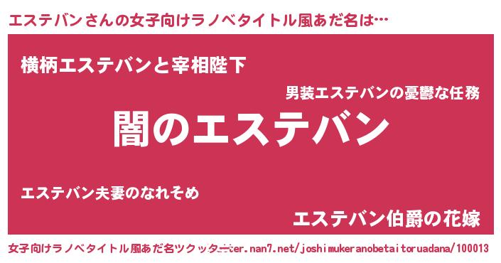 エステバンさんの女子向けラノベタイトル風あだ名は… 『闇のエステバン』『横柄エステバンと宰相陛下』『エステバン伯爵の花嫁』 ツクッター #女子向けラノベタイトル風あだ名ツクッター http://tkutter.nan7.net/joshimukeranobetaitoruadana/100013/