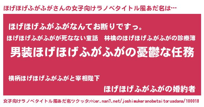 | 男性向けラノベタイトル風あだ名 | 『うちのほげほげふがふがが世界を掌握している!』 |