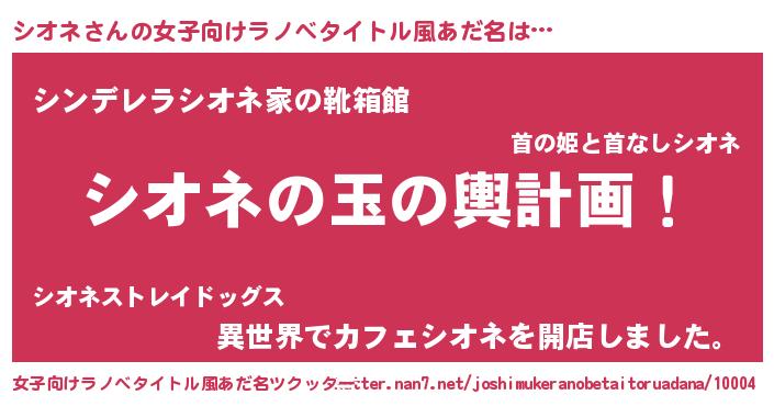 | 男性向けラノベタイトル風あだ名 | 『シオネ~年齢イコール彼女いない歴の魔法使い~』 |