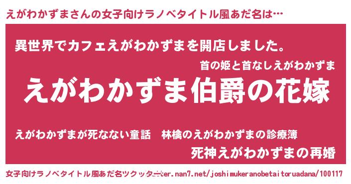 | 男性向けラノベタイトル風あだ名 | 『やはりえがわかずまの青春ラブコメはまちがっている 』 |