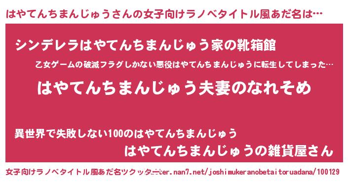 | 男性向けラノベタイトル風あだ名 | 『おまえをオタクにしてやるから、俺をはやてんちまんじゅうにしてくれ! 』 |