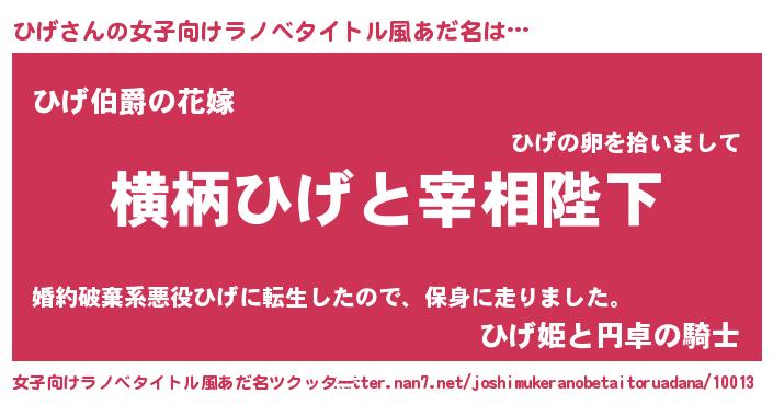 | 男性向けラノベタイトル風あだ名 | 『ひげに滅ぼされるだけの簡単なお仕事です』 |