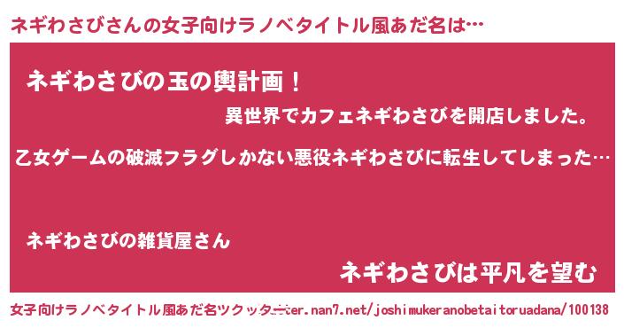 | 男性向けラノベタイトル風あだ名 | 『魔弾の王とネギわさび』 |