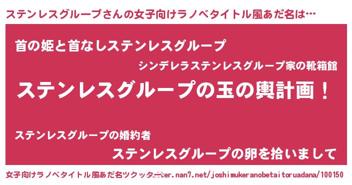 | 男性向けラノベタイトル風あだ名 | 『ステンレスグループ~年齢イコール彼女いない歴の魔法使い~』 |