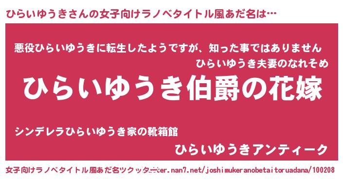 | 男性向けラノベタイトル風あだ名 | 『やはりひらいゆうきの青春ラブコメはまちがっている 』 |