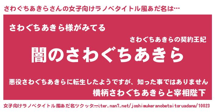 | 男性向けラノベタイトル風あだ名 | 『Re:さわぐちあきらから始める異世界生活』 |
