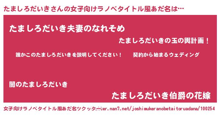 たましろだいきさんの女子向けラノベタイトル風あだ名は… 『誰かこのたましろだいきを説明してください! ~契約から始まるウェディング~』『たましろだいき夫妻のなれそめ』『たましろだいき伯爵の花嫁』 ツクッター #女子向けラノベタイトル風あだ名ツクッター http://tkutter.nan7.net/joshimukeranobetaitoruadana/100254/