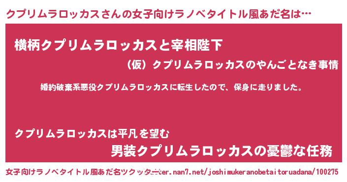| 男性向けラノベタイトル風あだ名 | 『クプリムラロッカススレイヤー』 |