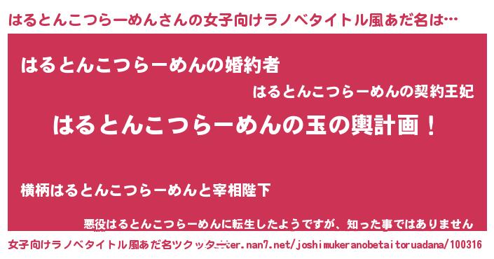 | 男性向けラノベタイトル風あだ名 | 『はるとんこつらーめん~年齢イコール彼女いない歴の魔法使い~』 |