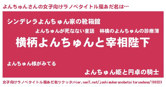| 男性向けラノベタイトル風あだ名 | 『よんちゅんに滅ぼされるだけの簡単なお仕事です』 |