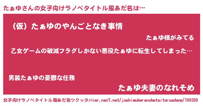 | 男性向けラノベタイトル風あだ名 | 『この素晴らしい世界にたぁゆを!』 |