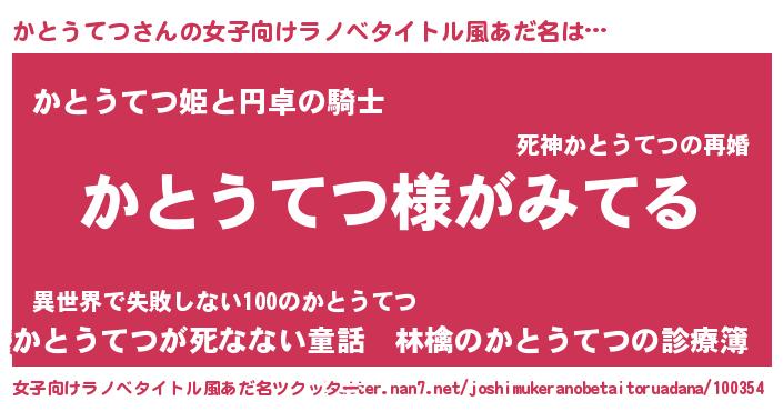 | 男性向けラノベタイトル風あだ名 | 『かとうてつの嫁は女の子じゃないと思った?』 |