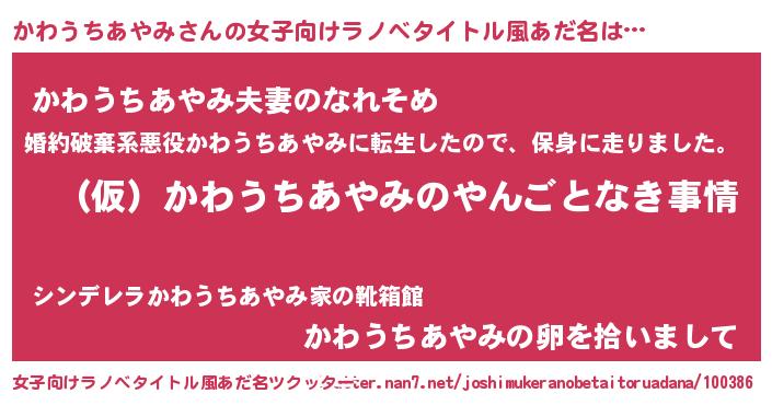 かわうちあやみさんの女子向けラノベタイトル風あだ名は… 『(仮)かわうちあやみのやんごとなき事情』『かわうちあやみ夫妻のなれそめ』『かわうちあやみの卵を拾いまして』 ツクッター #女子向けラノベタイトル風あだ名ツクッター http://tkutter.nan7.net/joshimukeranobetaitoruadana/100386/