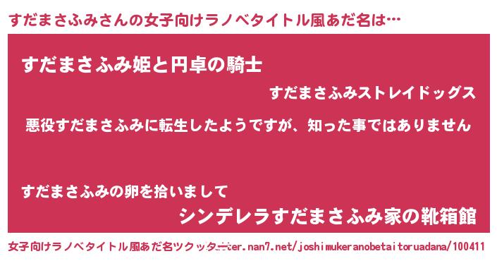 すだまさふみさんの女子向けラノベタイトル風あだ名は… 『悪役すだまさふみに転生したようですが、知った事ではありません』『すだまさふみ姫と円卓の騎士』『シンデレラすだまさふみ家の靴箱館』 ツクッター #女子向けラノベタイトル風あだ名ツクッター http://tkutter.nan7.net/joshimukeranobetaitoruadana/100411/