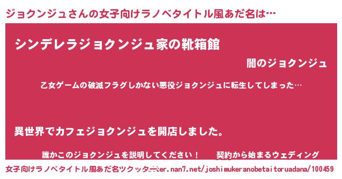 ジョクンジュさんの女子向けラノベタイトル風あだ名は… 『乙女ゲームの破滅フラグしかない悪役ジョクンジュに転生してしまった…』『シンデレラジョクンジュ家の靴箱館』『誰かこのジョクンジュを説明してください! ~契約から始まるウェディング~』 ツクッター #女子向けラノベタイトル風あだ名ツクッター http://tkutter.nan7.net/joshimukeranobetaitoruadana/100459/