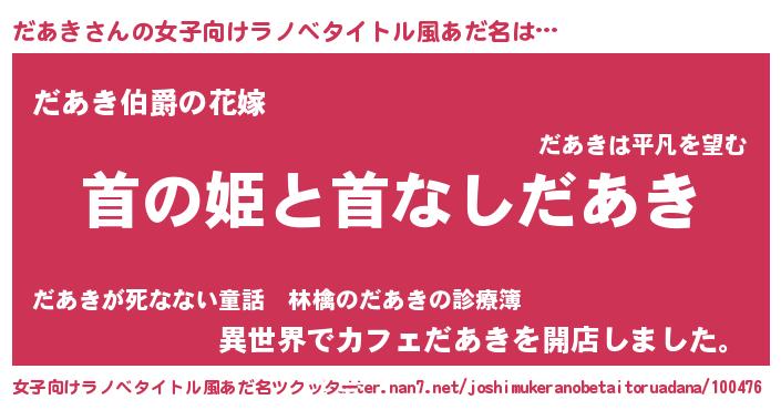 だあきさんの女子向けラノベタイトル風あだ名は… 『首の姫と首なしだあき』『だあき伯爵の花嫁』『異世界でカフェだあきを開店しました。』 ツクッター #女子向けラノベタイトル風あだ名ツクッター http://tkutter.nan7.net/joshimukeranobetaitoruadana/100476/