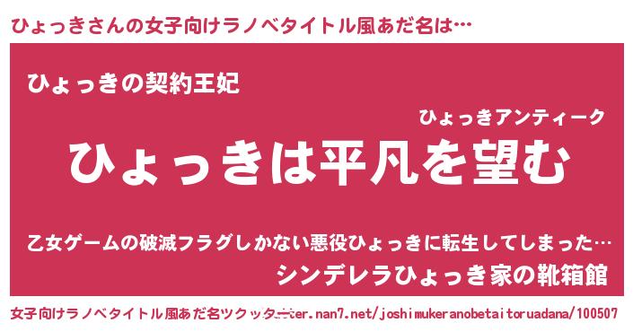 ひょっきさんの女子向けラノベタイトル風あだ名は… 『ひょっきは平凡を望む』『ひょっきの契約王妃』『シンデレラひょっき家の靴箱館』 ツクッター #女子向けラノベタイトル風あだ名ツクッター http://tkutter.nan7.net/joshimukeranobetaitoruadana/100507/