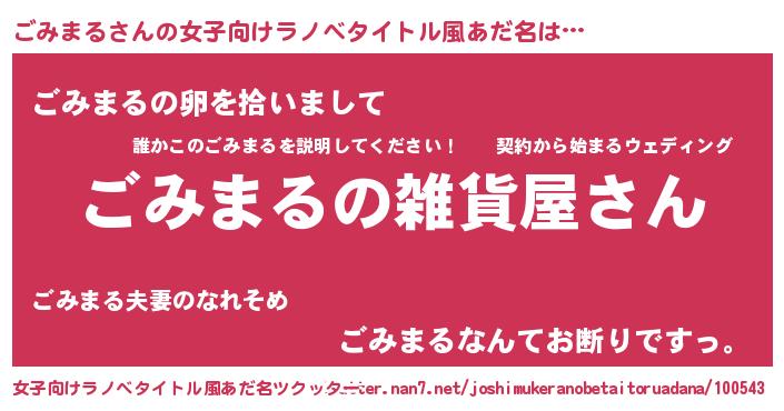 ごみまるさんの女子向けラノベタイトル風あだ名は… 『ごみまるの雑貨屋さん』『ごみまるの卵を拾いまして』『ごみまるなんてお断りですっ。』 ツクッター #女子向けラノベタイトル風あだ名ツクッター http://tkutter.nan7.net/joshimukeranobetaitoruadana/100543/