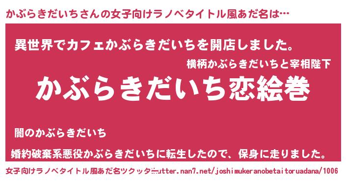 | 男性向けラノベタイトル風あだ名 | 『ノーゲーム・ノーカブラキダイチ』 |