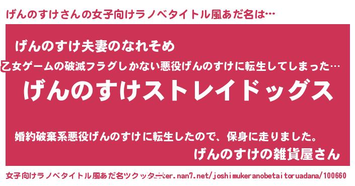 | 男性向けラノベタイトル風あだ名 | 『Re:げんのすけから始める異世界生活』 |