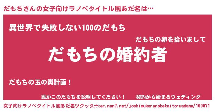| 男性向けラノベタイトル風あだ名 | 『うちの娘の為ならば、俺はもしかしたらだもちも倒せるかもしれない。』 |