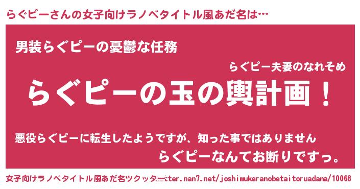 | 男性向けラノベタイトル風あだ名 | 『転生したららぐピーだった件』 |