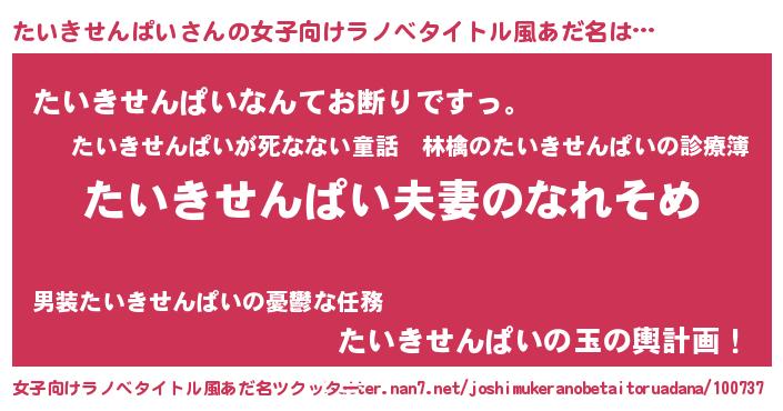 | 男性向けラノベタイトル風あだ名 | 『おまえをオタクにしてやるから、俺をたいきせんぱいにしてくれ! 』 |