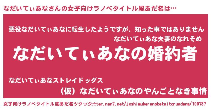 男性向けラノベタイトル風あだ名 | 『うちの娘の為ならば、俺はもしかしたらなだいてぃあなも倒せるかもしれない。』 |