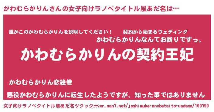 かわむらかりんさんの女子向けラノベタイトル風あだ名は… 『かわむらかりんの契約王妃』『誰かこのかわむらかりんを説明してください! ~契約から始まるウェディング~』『悪役かわむらかりんに転生したようですが、知った事ではありません』 ツクッター #女子向けラノベタイトル風あだ名ツクッター http://tkutter.nan7.net/joshimukeranobetaitoruadana/100790/