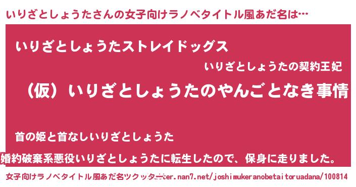 | 男性向けラノベタイトル風あだ名 | 『いりざとしょうたの憂鬱』 |