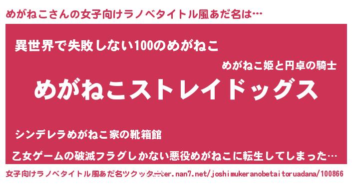 | 男性向けラノベタイトル風あだ名 | 『Re:めがねこから始める異世界生活』 |