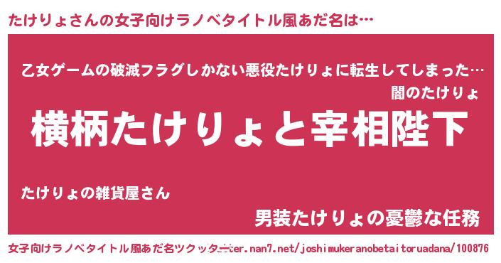 | 男性向けラノベタイトル風あだ名 | 『たけりょに滅ぼされるだけの簡単なお仕事です』 |