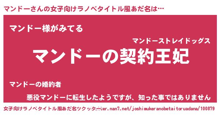 | 男性向けラノベタイトル風あだ名 | 『マンドーという概念が存在しない退屈な世界 』 |