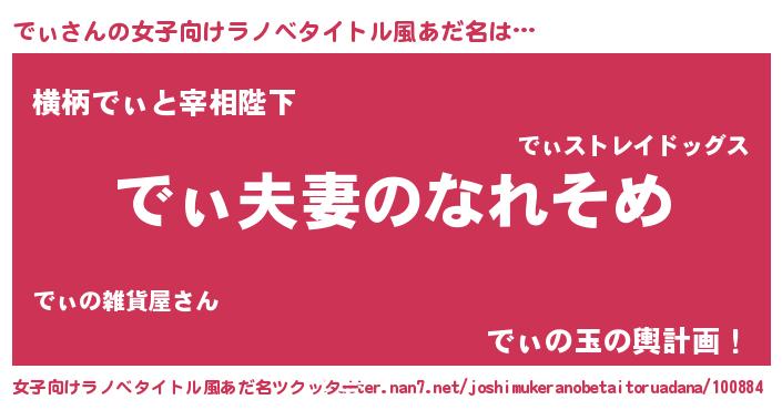 | 男性向けラノベタイトル風あだ名 | 『おまえをオタクにしてやるから、俺をでぃにしてくれ! 』 |