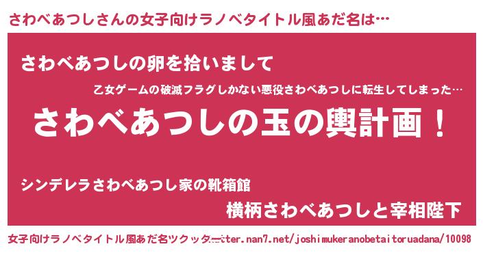 | 男性向けラノベタイトル風あだ名 | 『さわべあつし~年齢イコール彼女いない歴の魔法使い~』 |