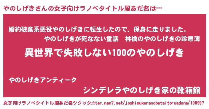 | 男性向けラノベタイトル風あだ名 | 『やのしげきという概念が存在しない退屈な世界 』 |