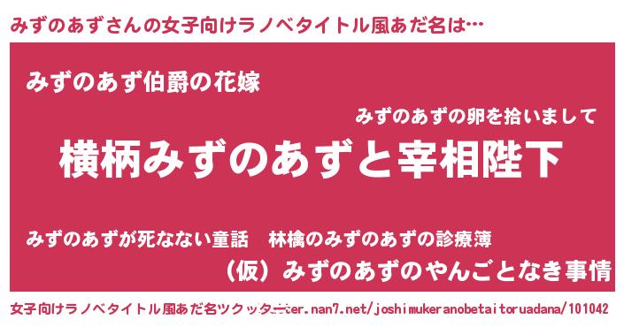 | 男性向けラノベタイトル風あだ名 | 『みずのあずに滅ぼされるだけの簡単なお仕事です』 |