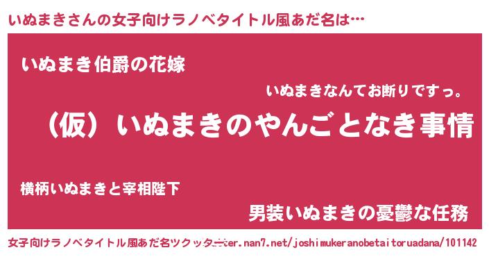 いぬまきさんの女子向けラノベタイトル風あだ名は… 『(仮)いぬまきのやんごとなき事情』『いぬまき伯爵の花嫁』『男装いぬまきの憂鬱な任務』 ツクッター #女子向けラノベタイトル風あだ名ツクッター http://tkutter.nan7.net/joshimukeranobetaitoruadana/101142/
