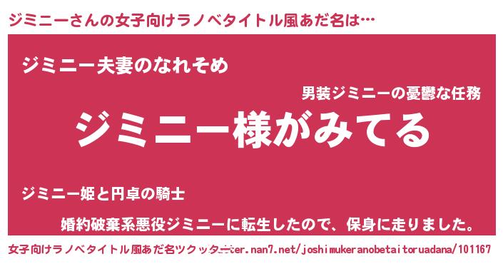 | 男性向けラノベタイトル風あだ名 | 『ジミニーの嫁は女の子じゃないと思った?』 |