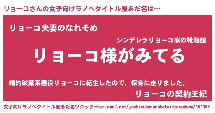 | 男性向けラノベタイトル風あだ名 | 『リョーコの嫁は女の子じゃないと思った?』 |
