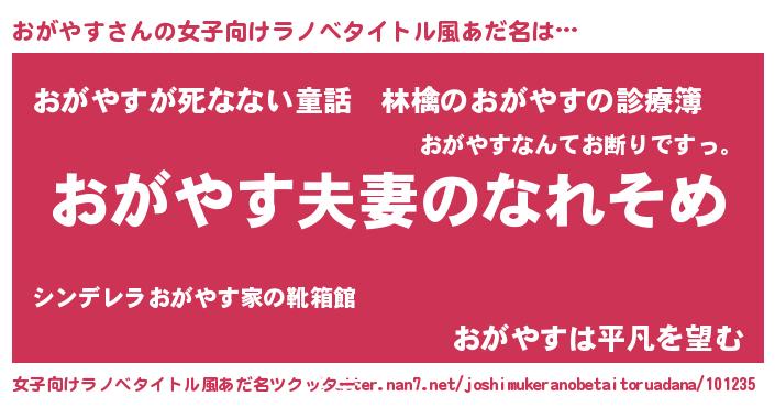 | 男性向けラノベタイトル風あだ名 | 『おまえをオタクにしてやるから、俺をおがやすにしてくれ! 』 |