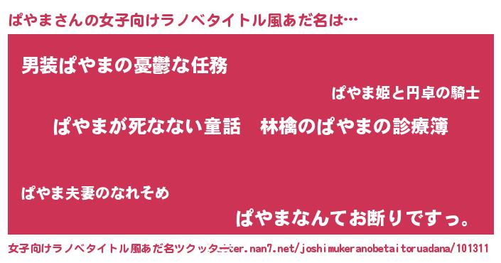 | 男性向けラノベタイトル風あだ名 | 『魔弾の王とぱやま』『ぱやまの憂鬱』 |