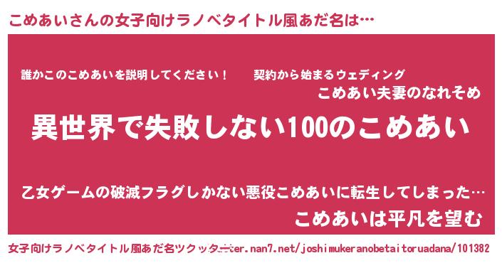 こめあいさんの女子向けラノベタイトル風あだ名は… 『異世界で失敗しない100のこめあい』『誰かこのこめあいを説明してください! ~契約から始まるウェディング~』『こめあいは平凡を望む』 ツクッター #女子向けラノベタイトル風あだ名ツクッター http://tkutter.nan7.net/joshimukeranobetaitoruadana/101382/