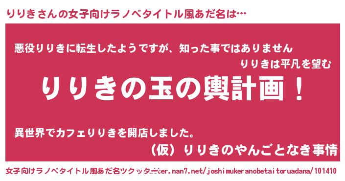 | 男性向けラノベタイトル風あだ名 | 『りりき~年齢イコール彼女いない歴の魔法使い~』 |