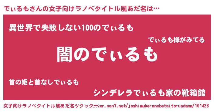 でぃるもさんの女子向けラノベタイトル風あだ名は… 『闇のでぃるも』『異世界で失敗しない100のでぃるも』『シンデレラでぃるも家の靴箱館』 ツクッター #女子向けラノベタイトル風あだ名ツクッター http://tkutter.nan7.net/joshimukeranobetaitoruadana/101428/