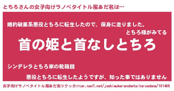 | 男性向けラノベタイトル風あだ名 | 『はたらくとちろさま!』『緋弾のトチロ』 |