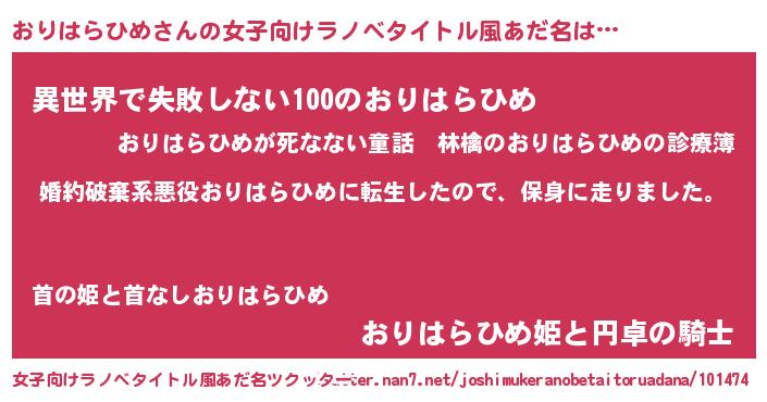 | 男性向けラノベタイトル風あだ名 | 『オリハラヒメスレイヤー』 |