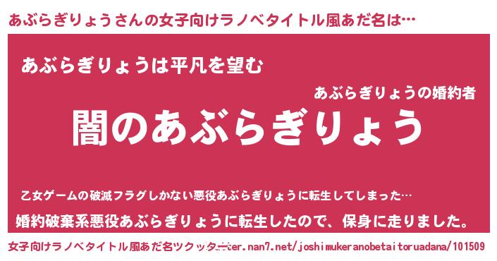| 男性向けラノベタイトル風あだ名 | 『Re:あぶらぎりょうから始める異世界生活』 |
